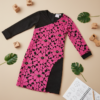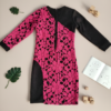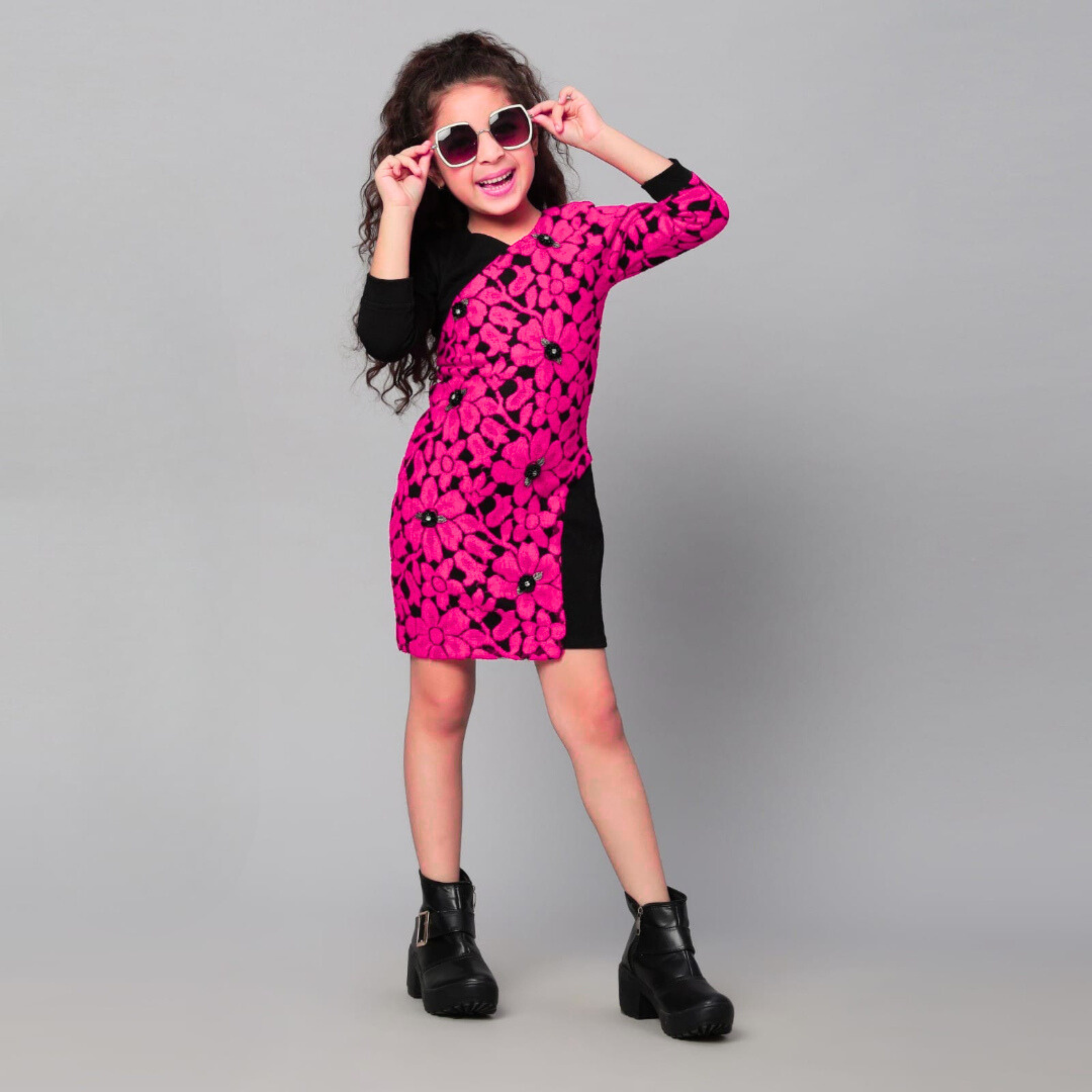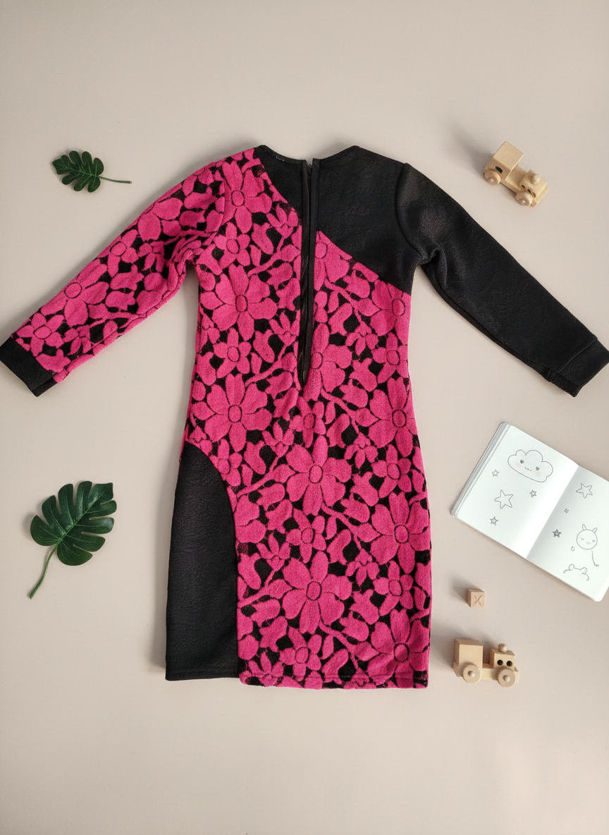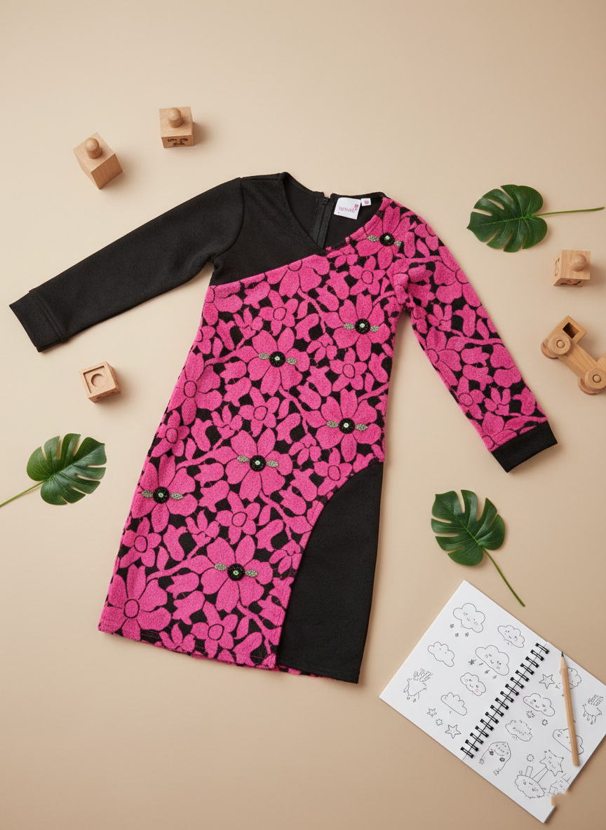 Striking one-shoulder girls’ dress featuring a vibrant pink floral pattern with contrasting black panel detail — a confident and fashion-forward outfit perfect for parties and special occasions.