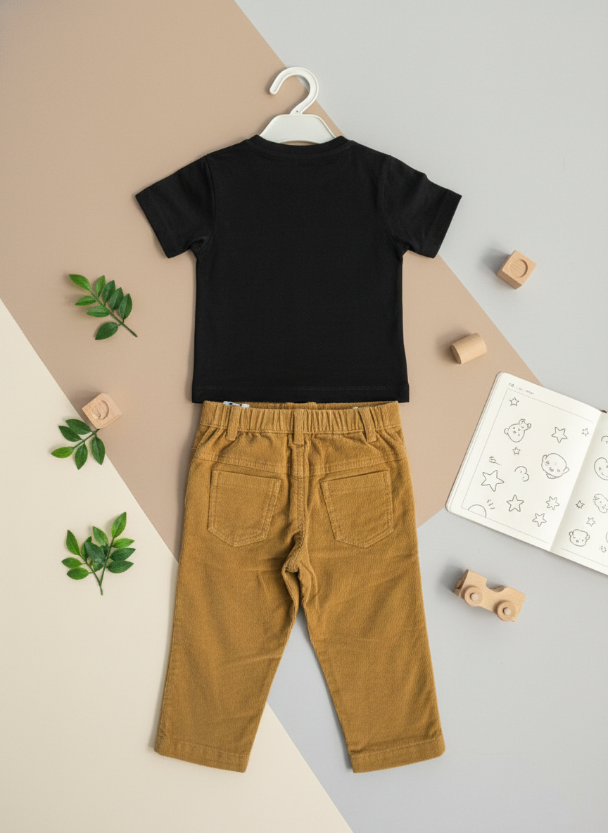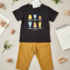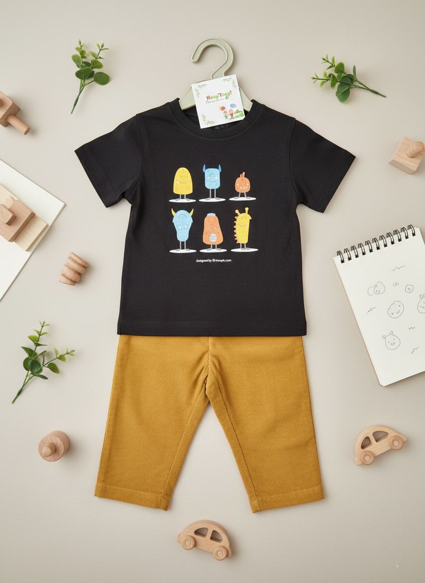 Add a touch of playful mischief to his daily adventures with the Graphic T-shirt Set. This isn’t just a basic t-shirt and pant combo; it’s a canvas for imagination, featuring a colorful lineup of quirky, hand-drawn monster characters paired with rugged, stylish pull-on trousers.