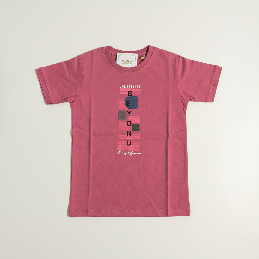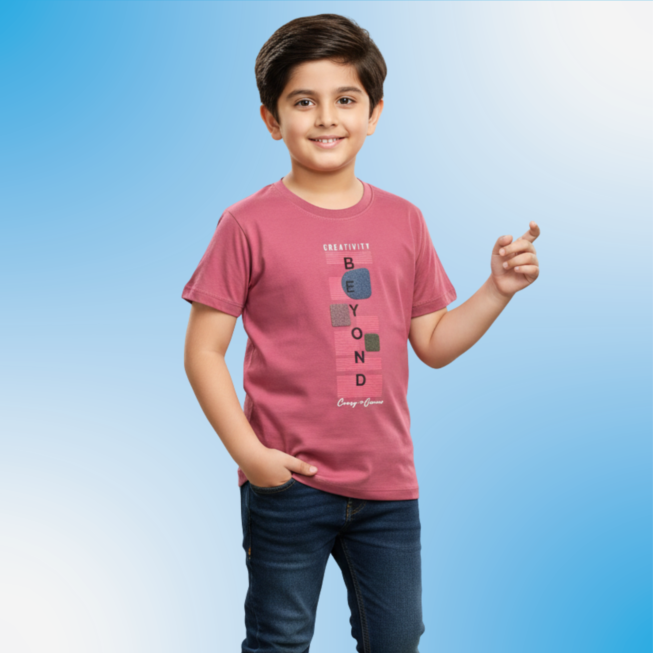 Let his imagination run wild with the Boys Pink Graphic Printed Cotton T-Shirt-“Creativity Beyond”. This soft pink t-shirt transforms a casual staple into a piece of wearable art, featuring a unique vertical design that encourages thinking outside the box.