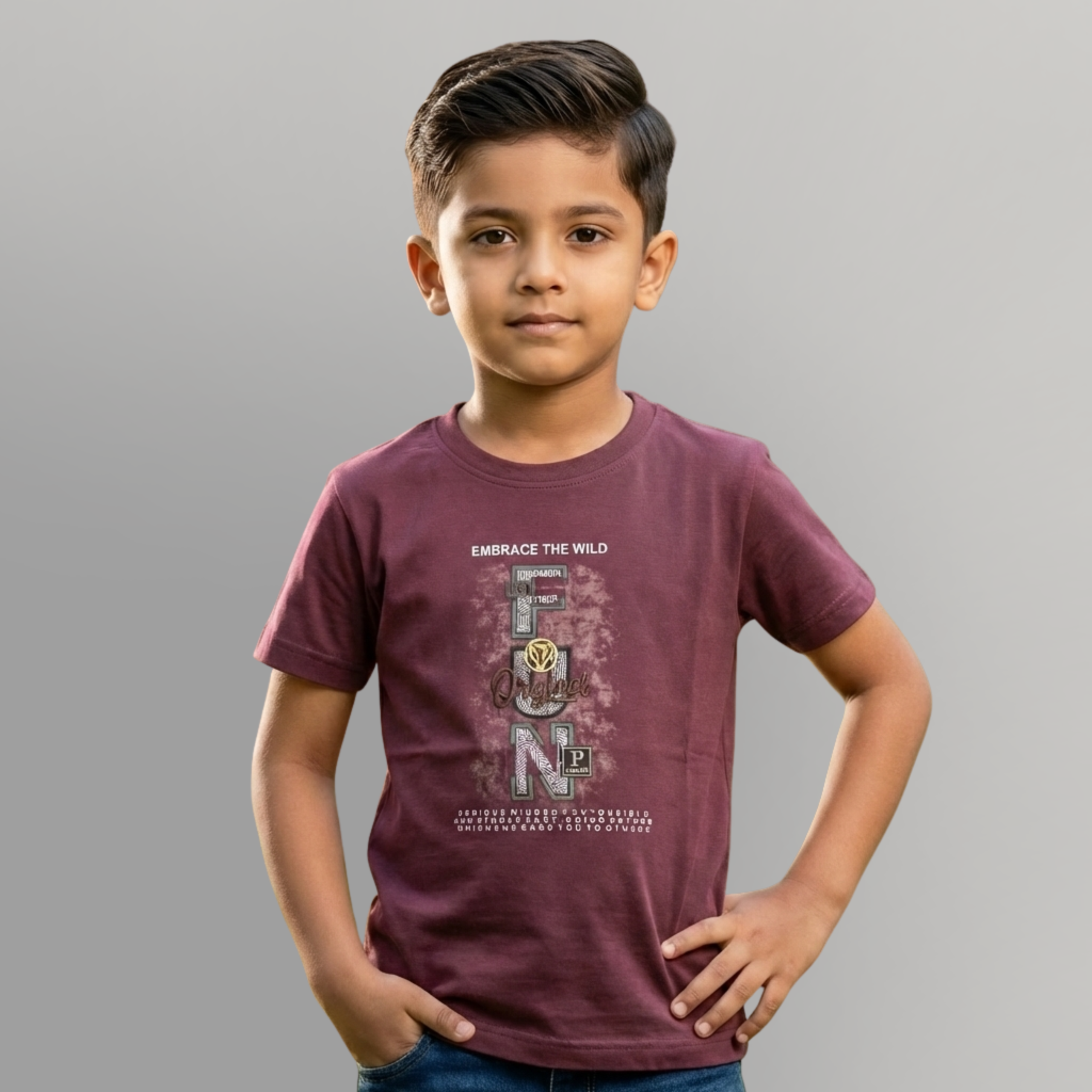 The center graphic features a vertical, stacked arrangement of the word “FUN,” designed with a mix of geometric patterns and “USA” tag details. It’s overlaid with a stylish “Original” script and topped with the slogan “Embrace the Wild.” The design is grounded by a block of text at the hem describing a “Serious minded, responsible, and stable” personality—making this tee a perfect conversation starter for the kid with a great character.
