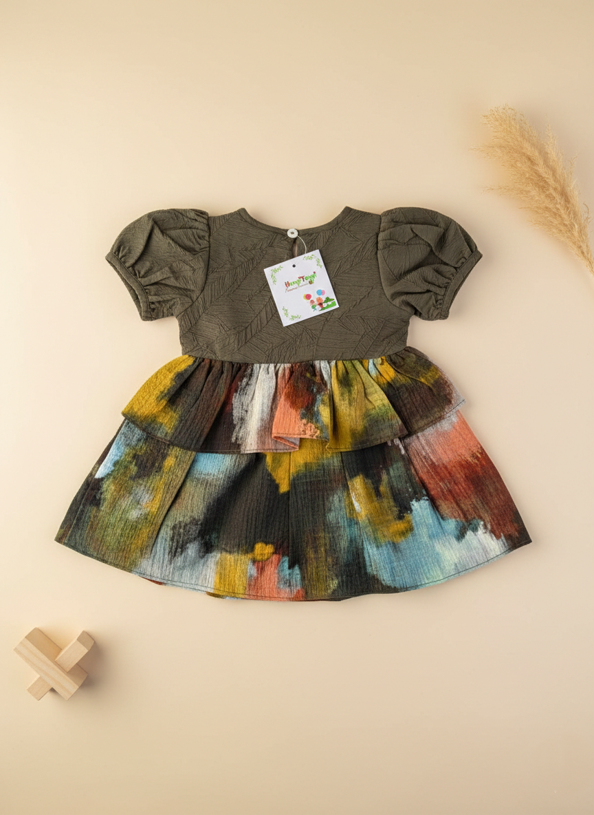 Inspire her creativity with the “Girls Olive Green Printed Layered Dress with Puff Sleeves”. This unique frock features a bodice crafted from a crinkled, leaf-textured fabric in a rich olive-brown shade, giving it a beautiful, organic feel.