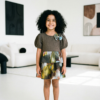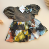 The skirt steals the show with a stunning abstract print resembling watercolor paint strokes in earthy tones of gold, blue, rust, and brown. Finished with puffed sleeves and a tiered silhouette, this dress is a wearable masterpiece for the little girl with a big imagination.
