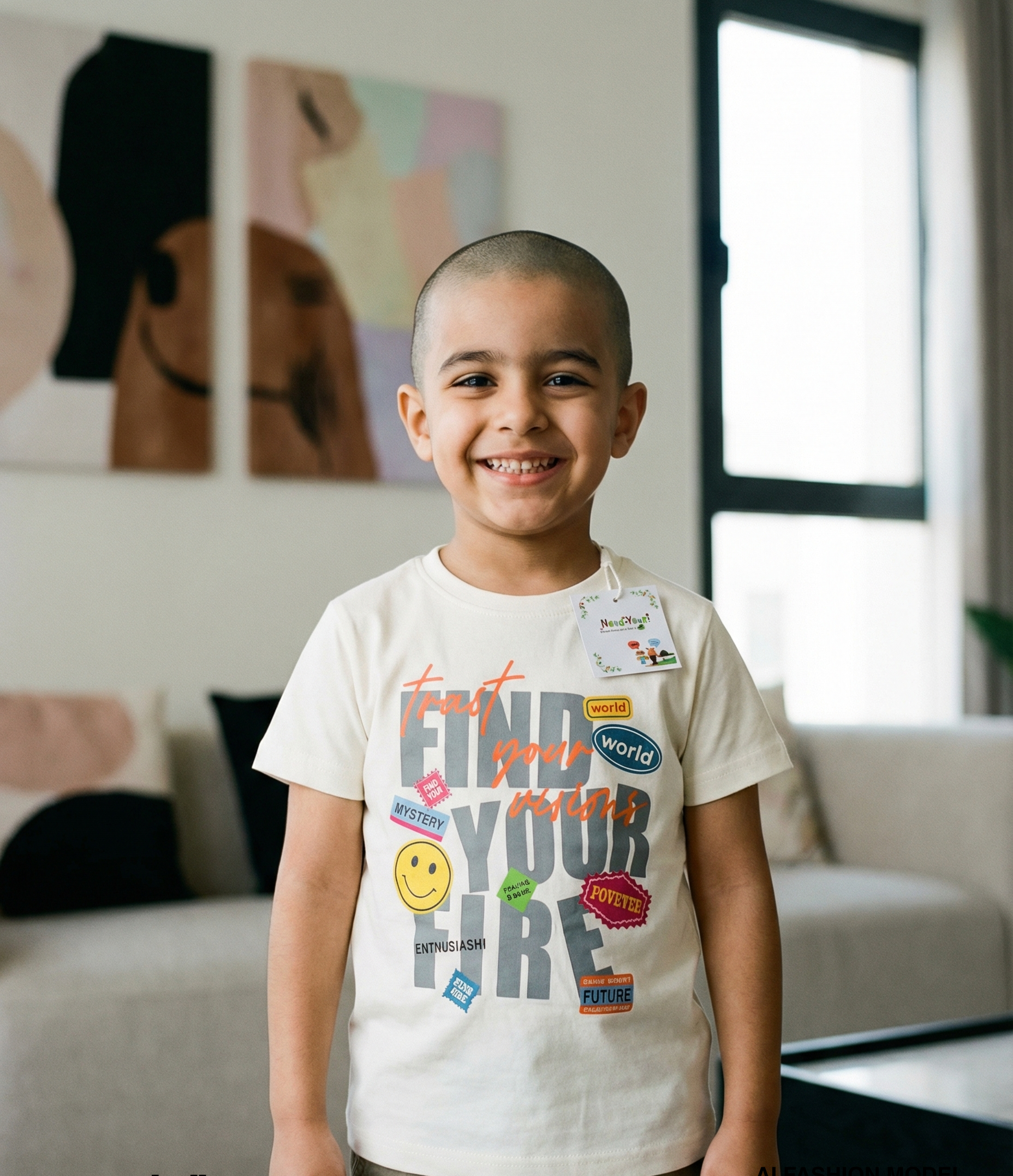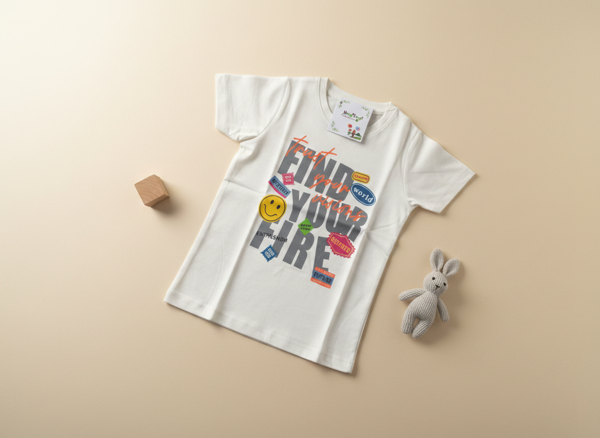 The centerpiece “FIND YOUR FIRE” text is overlaid with an inspiring “Trust your visions” script in orange, surrounded by playful motifs like a classic smiley face, “Mystery” tags, and “Future” badges. It’s a look that says confidence and creativity, wrapped up in the comfort of soft, high-quality fabric.